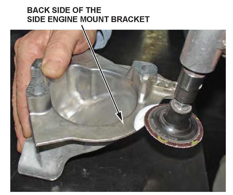 12. If the feeler gauge did fit in step 5, go to step 13. If the feeler gauge did not fit in step 5, remove the side engine mount bracket. Using a die grinder with a 2-inch, 50-grit grinding disc (or equivalent) and the circular casting offset as a guide, grind the side engine mount bracket until the lip measures 2 mm thick with a caliper or micrometer.