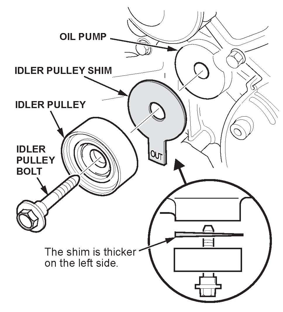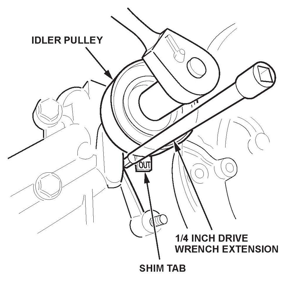 16. When tightening the idler pulley bolt, use the square end of a 1/4 inch drive ratchet extension to keep the shim's tab in the correct position. After you tighten the idler pulley bolt to 44 N~m (33 lb-ft), bend the shim's tab slightly towards the oil pump housing to keep it away from the idler pulley.