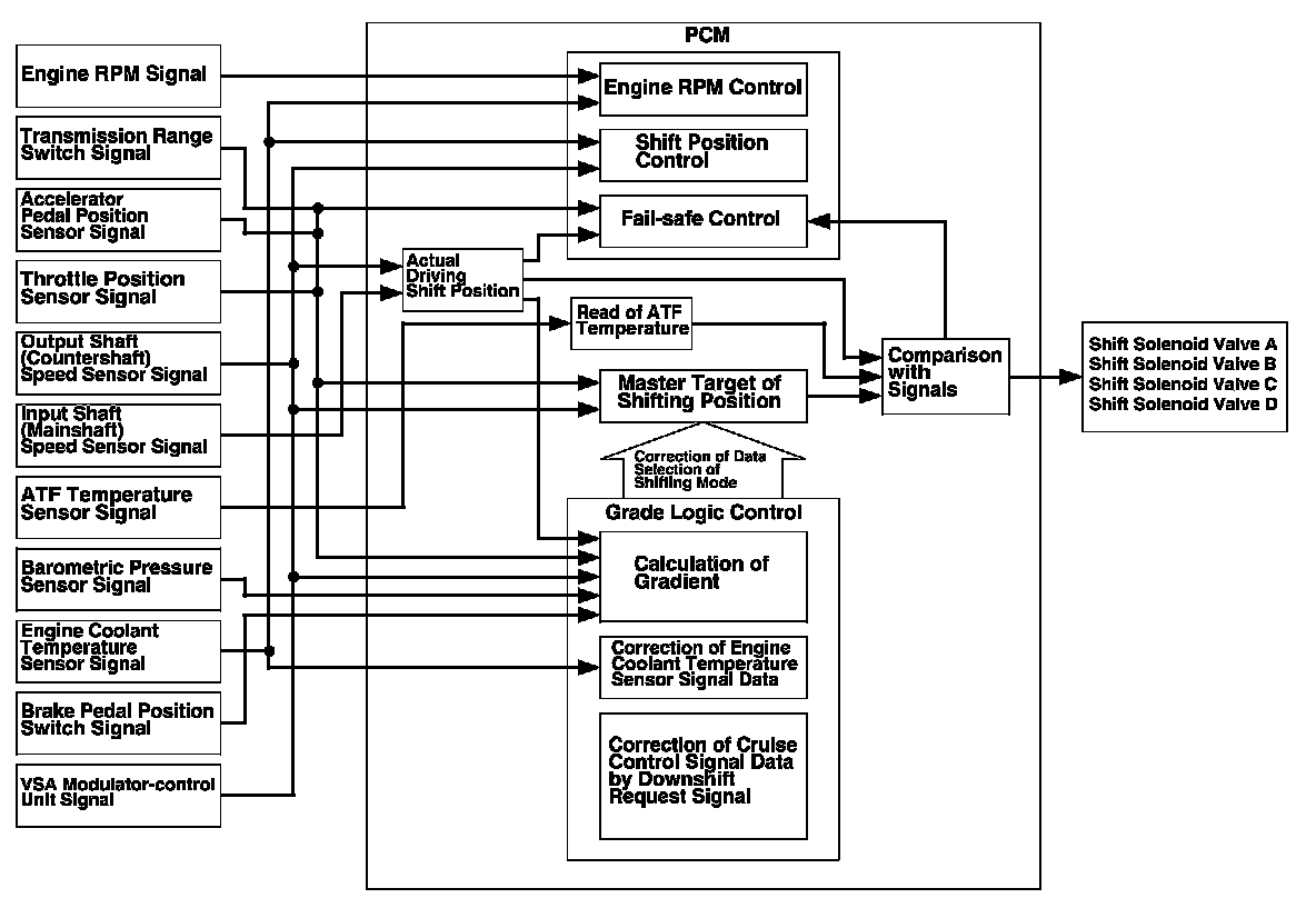 The grade logic control system is used to control shifting in D, and in S with automatic shift mode. The PCM compares actual driving conditions with programmed driving conditions, based on the input from the throttle position sensor, the engine coolant temperature sensor, the barometric pressure sensor, the brake pedal position switch signal, and the shift lever position signal, to improve shifting control while the vehicle is ascending or descending a slope.