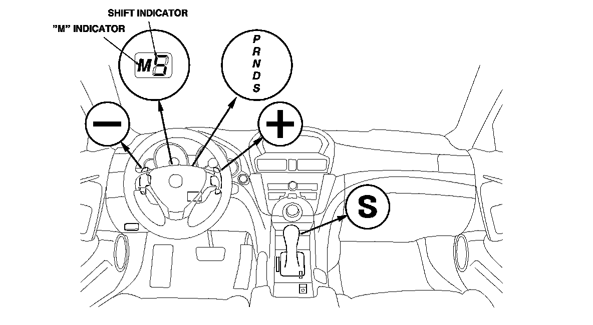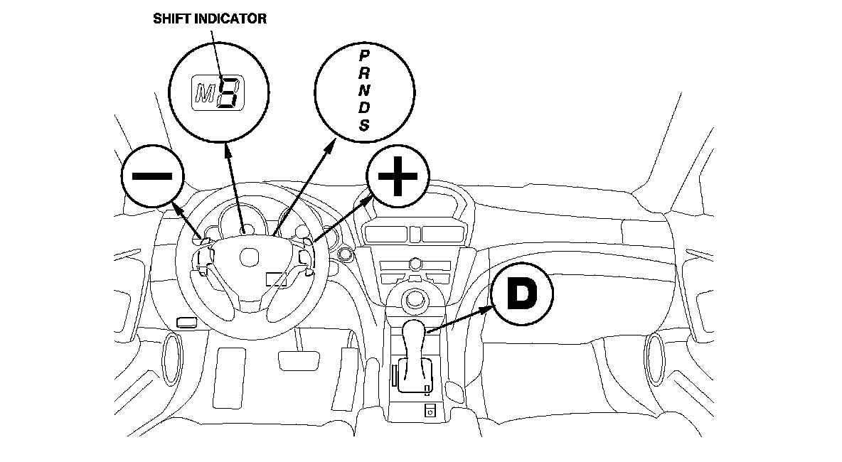 The transmission is provided with a D-paddle shift mode in D, and with a sequential sportshift mode in S. Either mode can be activated by pressing the paddle shifter + (upshift switch) or paddle shifter - (downshift switch) while driving with the shift lever in D and S.