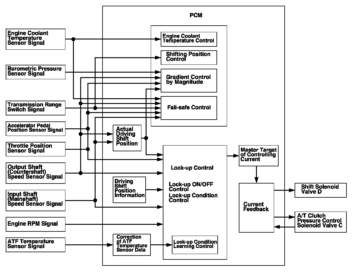 The PCM receives input signals from the sensors, switches, and other control units, processes data, and outputs signals for the engine control system and A/T control system. The A/T control system includes shift control, clutch pressure control, and lock-up control. The PCM switches the shift solenoid valves and the A/T clutch pressure control solenoid valves on and off in a specific sequence to control gear selection and torque converter clutch lock-up.