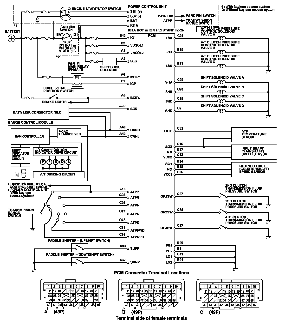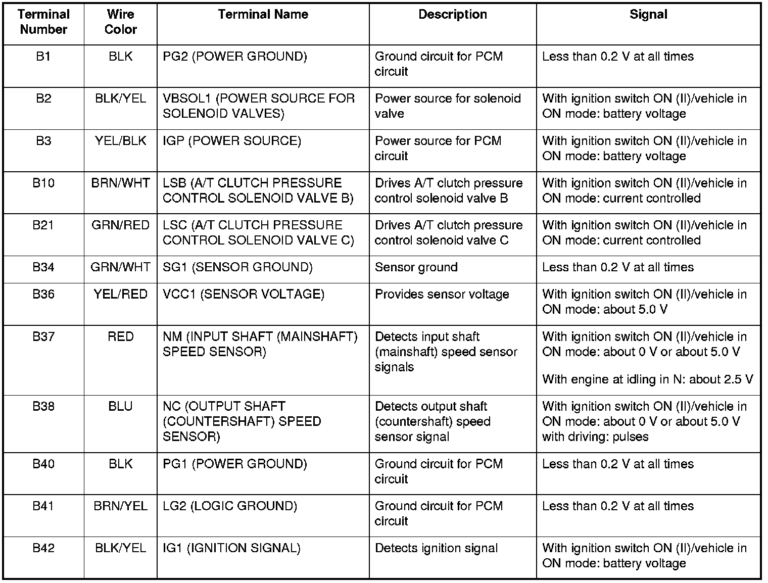 PCM A/T Control System Inputs and Outputs at Connector B (triangle) (49P)