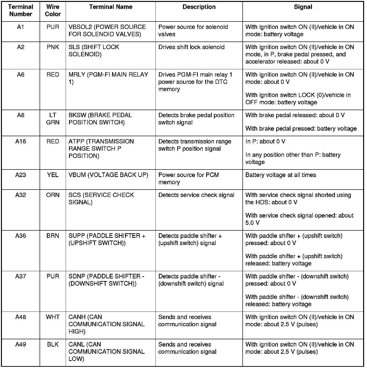 PCM A/T Control System Inputs and Outputs at Connector A (square) (49P)