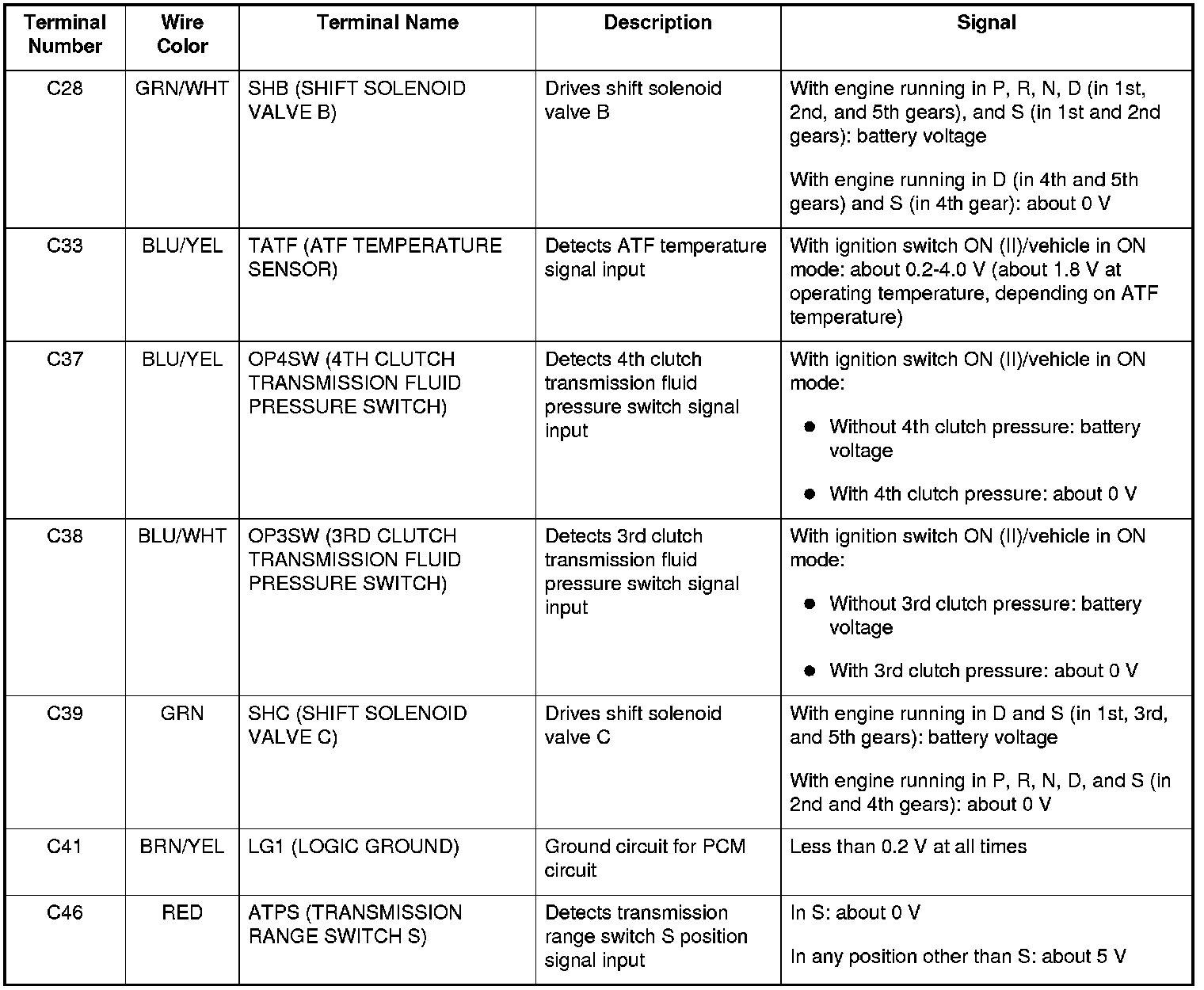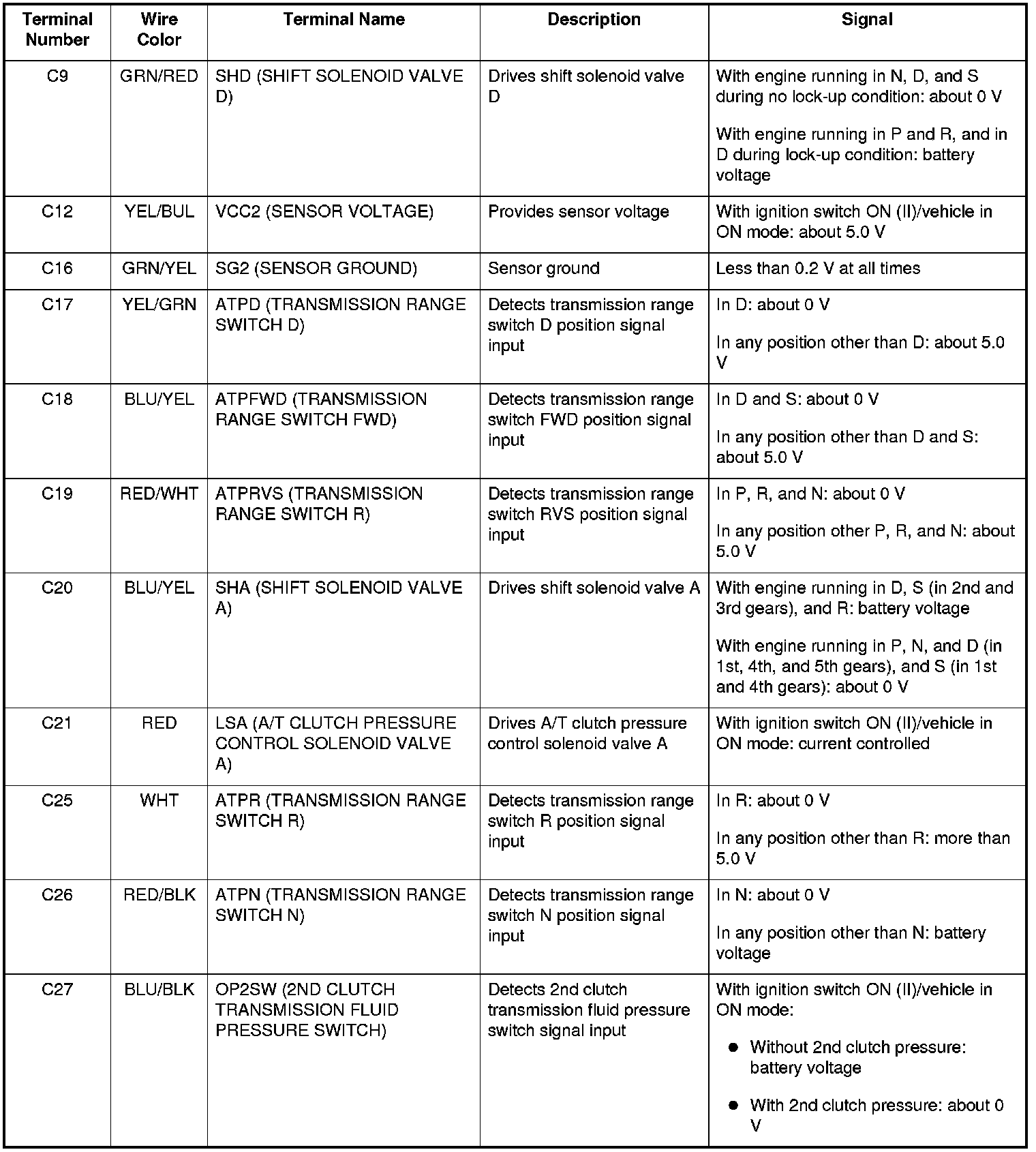 The combination of driving signals to shift solenoid valves A, B, C, and D for each gear are in the following table.