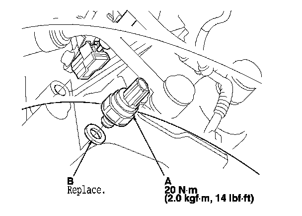 4. Install a new 3rd clutch transmission fluid pressure switch and a new sealing washer (B), and tighten the switch.