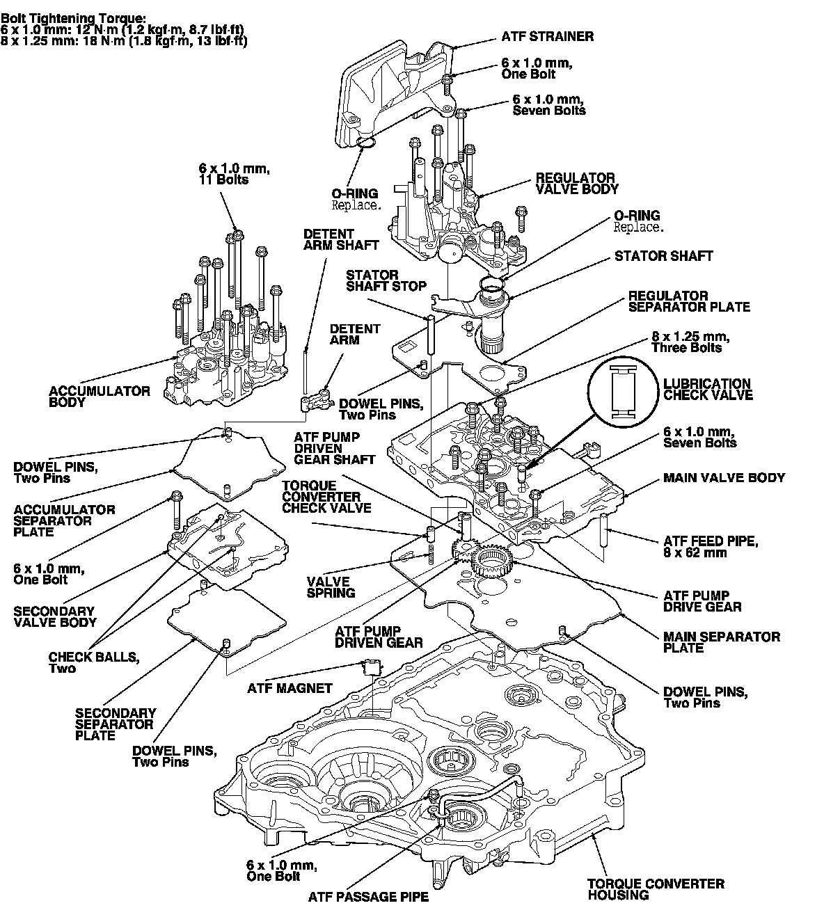 5. If the ATF pump drive gear and the ATF pump driven gear shaft do not move smoothly, loosen the main valve body bolts. Realign the ATF pump driven gear shaft, and retighten the bolts to the specified torques, then recheck. Failure to align the ATF pump driven gear shaft correctly will result in a seized ATF pump drive gear or ATF pump driven gear shaft.