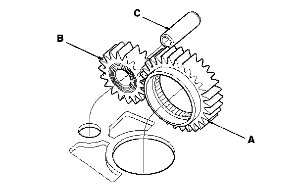 2. Install the main separator plate and the two dowel pins on the torque converter housing. Then install the ATF pump drive gear (A), the driven gear (B), and the ATF pump driven gear shaft (C). Install the ATF pump driven gear with its grooved and chamfered side facing down.