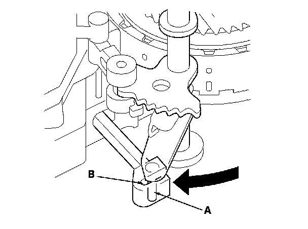 25. Turn the shift fork shaft (B) so the large chamfered hole is facing the fork bolt hole of the shift fork.
