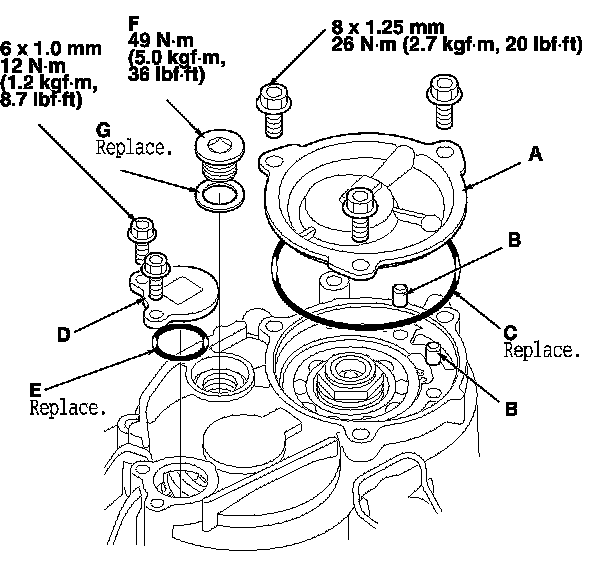 46. Apply thread lock sealant to the threads of the sealing plug (F), and install the sealing plug and a new sealing washer (G).