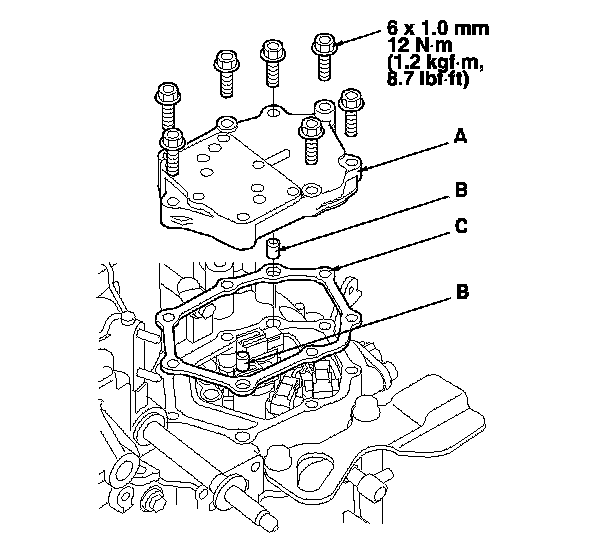 51. Install the solenoid valve cover (A) with the two dowel pins (B) and a new gasket (C), and secure it with the seven bolts.