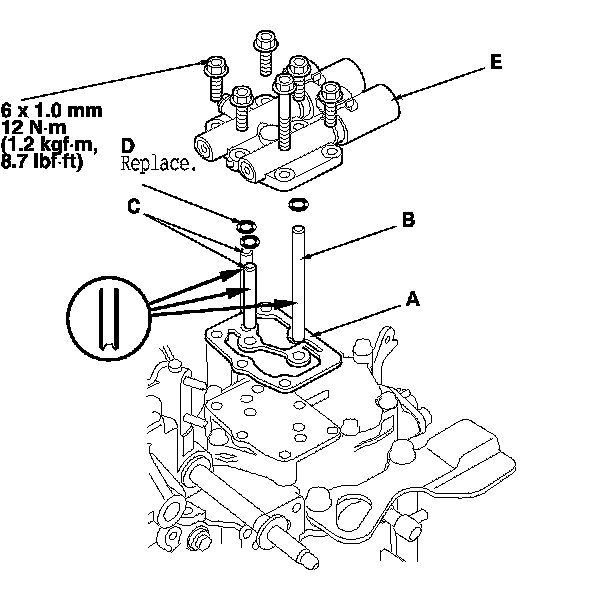 39. Install and tighten the 12 x 1.25 mm bolt (E) to 64 N-m (6.5 kgf-m, 47 lbf-ft).