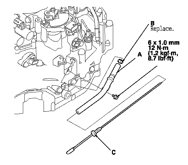 74. Install the ATF dipstick guide tube (A) with a new O-ring (B).