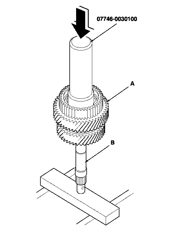 2. Slide a new mainshaft 4th gear (A) over the mainshaft (B), then press it into place using the 40 mm driver handle and a press.