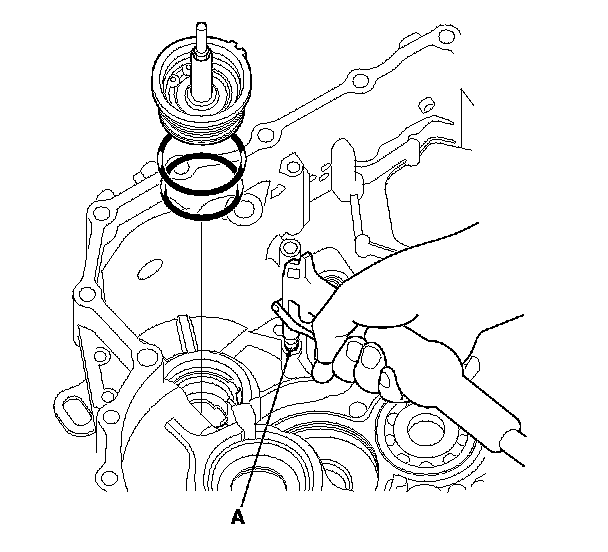 2. Apply air pressure to the ATF feed pipe hole (A) of the 1st-hold clutch pressure circuit, and remove the ATF feed pipe cap from the transmission housing.