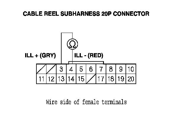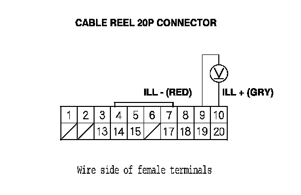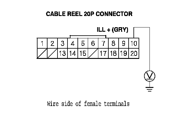 5. Measure the voltage between cable reel 20P connector terminals No. 9 and No. 10.