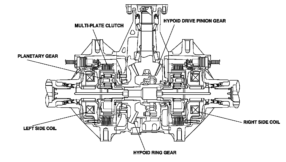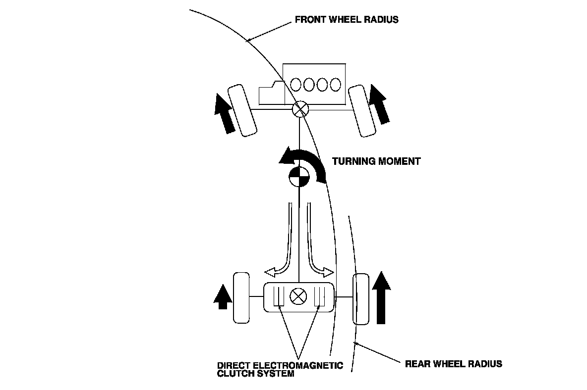 2. The direct electromagnetic clutch system consists of the coils, the planetary gear sets, and the multi-plate clutches that are installed in the side cases on either side of the differential carrier. When driving straight ahead, both rear wheels rotate at the same speed. When turning, current is applied to the appropriate outside wheel main coil to engage the clutch. The amount of current passed through the electromagnetic clutch controls the amount of driving force to the outside wheel.
