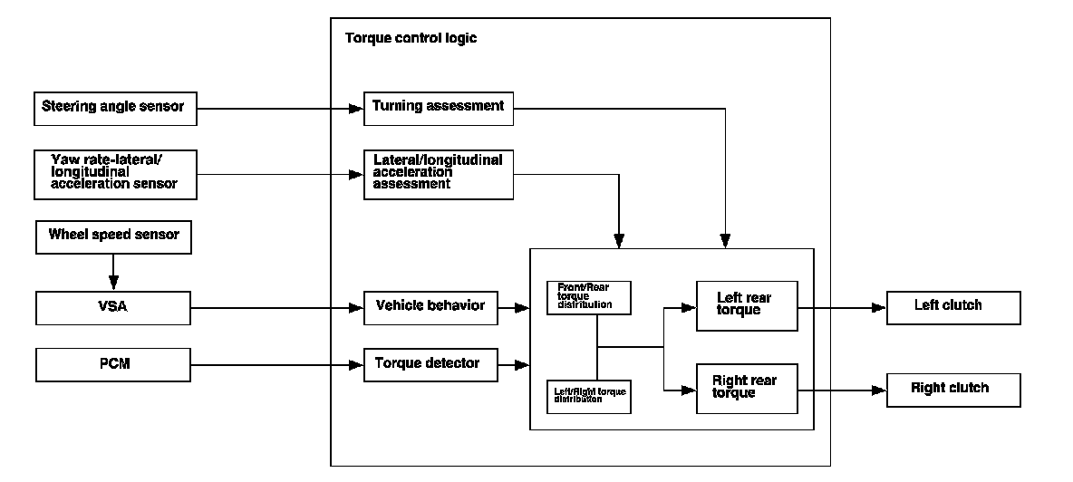 The SH-AWD control system consists of a SH-AWD control unit, the PCM, the VSA modulator-control unit, along with various sensors and switches that detect the steering angle, the lateral G force, the yaw, and the vehicle speed. A fluid temperature sensor is located on the rear differential. The control units exchange information via the CAN communication lines. The SH-AWD control unit has a self-diagnostic function. If a malfunction is detected, the SH-AWD control unit turns on the SH-AWD indicator in the gauge control module, and the system goes into fail-safe mode. When in fail-safe mode, the vehicle disables the SH-AWD differential. The vehicle defaults to front wheel drive and reduces engine torque to suit the driving conditions.