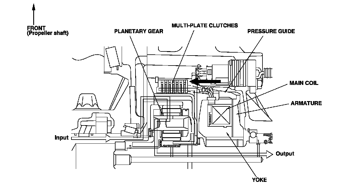 The electromagnetic clutch system is incorporated into the side case assemblies on both sides of the differential case. The system consists of the multi-plate clutches, the planetary gears, the pressure guides, the solenoid coil assembly (the search coil and the main coil), the armature assembly (the slider and the armature), and the yoke.