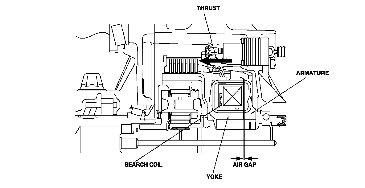 As the clutch discs wear, the air gap between the pressure guides and the multi-plate clutches decrease. The decrease in air gap changes the magnetic field generated by the main coil and the yoke. The search coil detects these changes in the magnetic field. The SH-AWD control unit uses predetermined maps to compensate for the changes to maintain precise control and smooth clutch engagement.