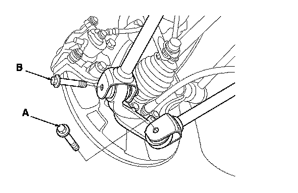 4. Remove the lower arm A mounting bolt (A) and the lower arm B mounting bolt (B).
