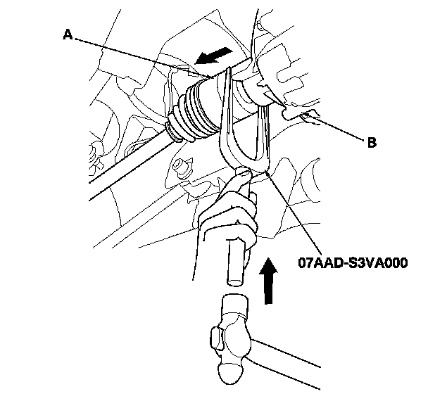 5. Use a hammer to wedge the driveshaft remover between the inboard joint (A) and the rear differential (B).