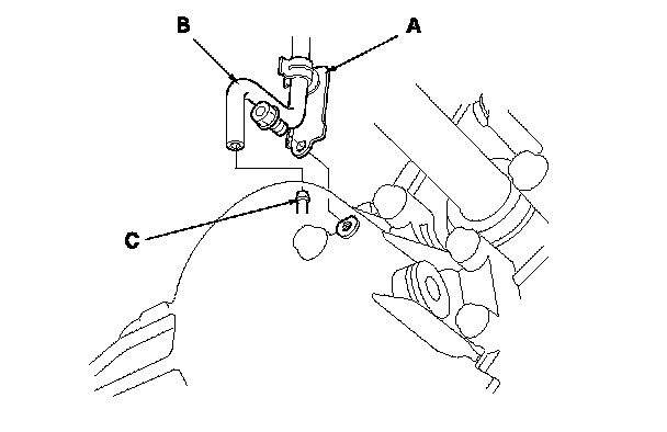 7. Remove the bolt securing the transfer breather hose bracket (A), and disconnect the breather hose (B) from the breather pipe (C) on the transfer assembly.