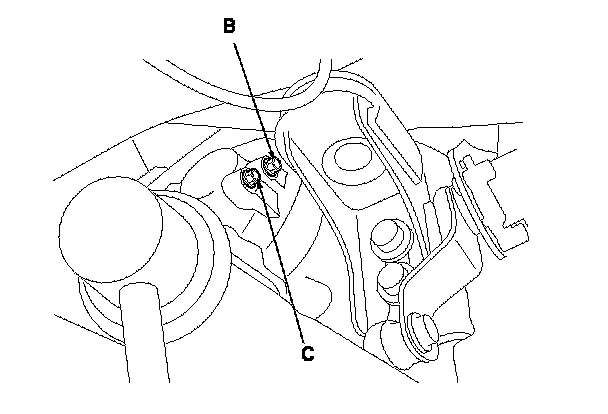 13. Connect the A/T oil pressure gauge to the 1st clutch pressure inspection port (B) and the 1st-hold clutch pressure inspection port (C).