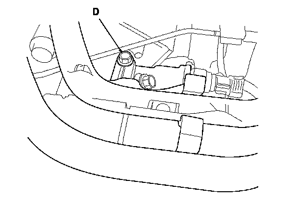 17. Upshift to 2nd gear by pressing the paddle shifter + (upshift switch), and measure the 2nd clutch pressure at the 2nd clutch pressure inspection port (D) while holding the engine speed at 2,000 rpm.