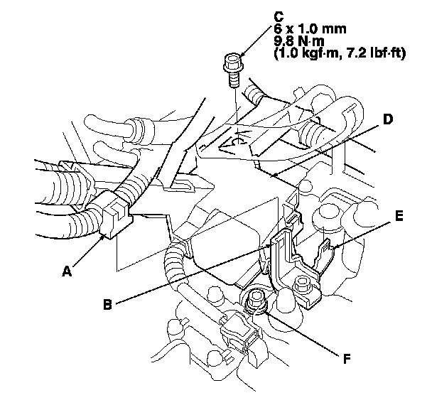 23. Remove the bolt (C) securing the harness cover (D), and remove the harness cover from its bracket (E), then temporarily install the air cleaner.
