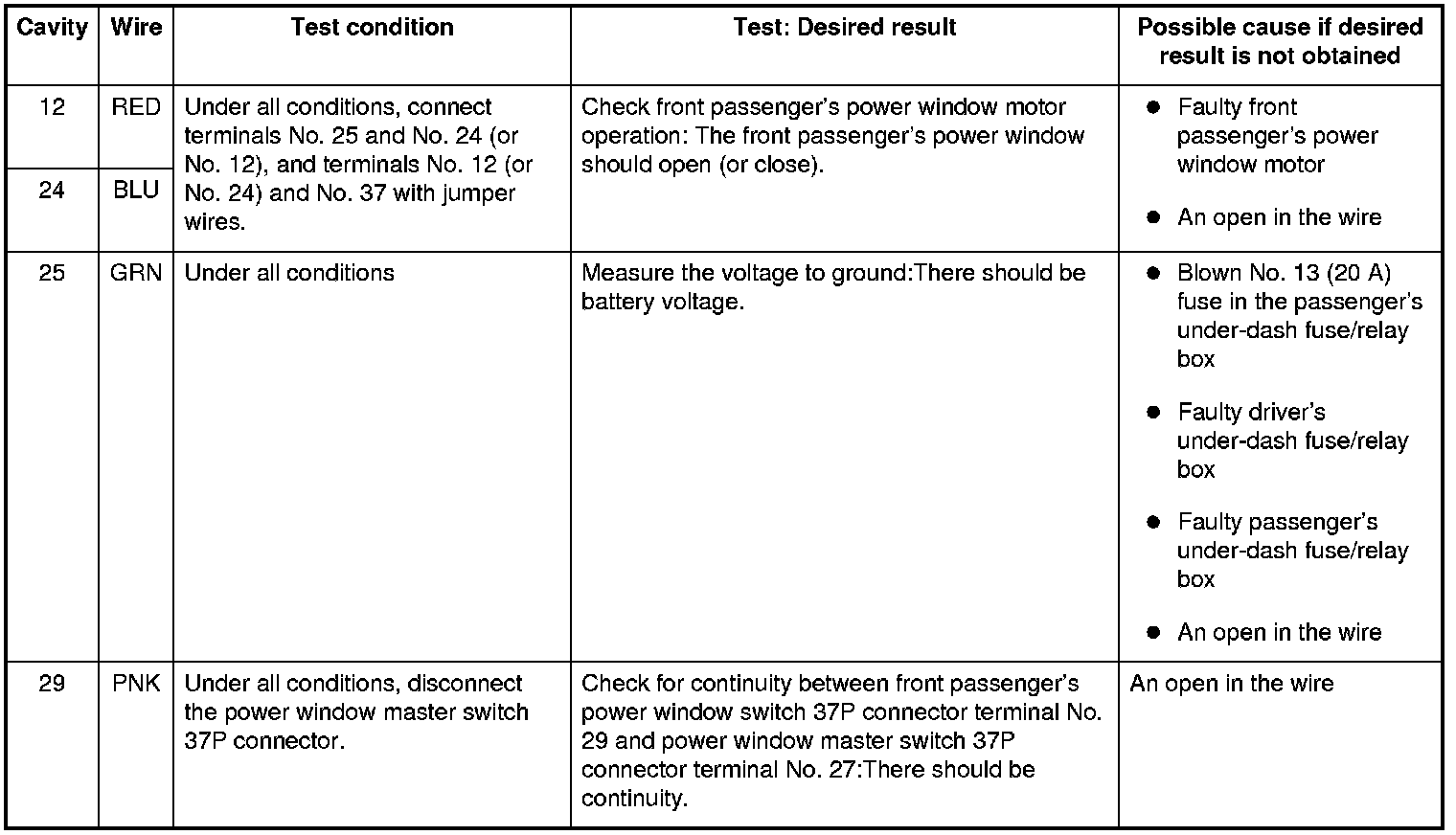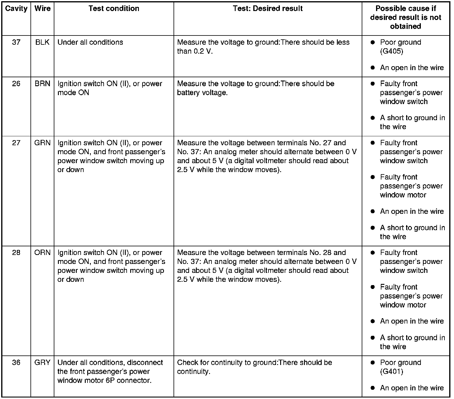 5. Reconnect the front passenger's power window switch connector to the front passenger's power window switch, and do these input tests at the following connector.