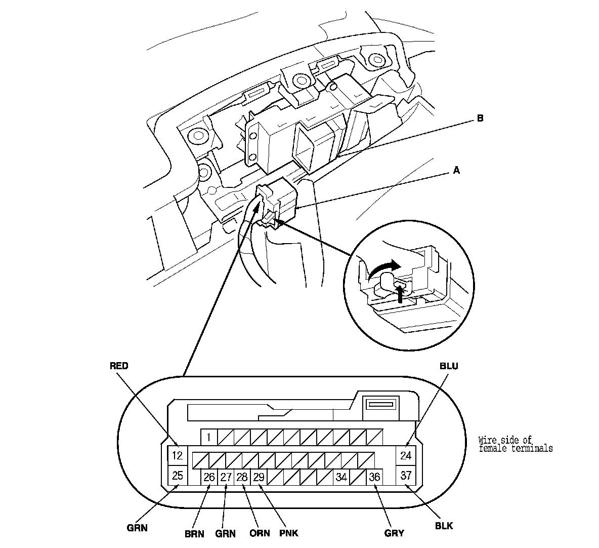 2. Disconnect the front passenger's power window switch 37P connector (A) from the front passenger's power window switch (B).
