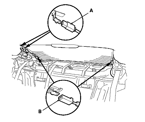 2. Disconnect the window antenna connectors (A) and the rear window defogger connectors (B).
