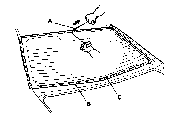 6. With a helper on the outside, pull the piano wire (A) back and forth in a sawing motion. Hold the piano wire as close to the rear window (B) as possible to prevent damage to the body, and carefully cut through the adhesive (C) around the entire rear window.