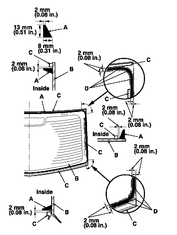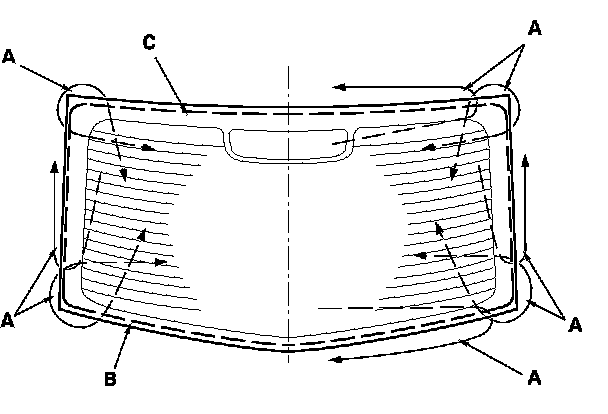 19. Put the cartridge in a caulking gun, and run a continuous bead of adhesive (A) to the rear window (B) along the edge of the rubber dams (C) as shown:
