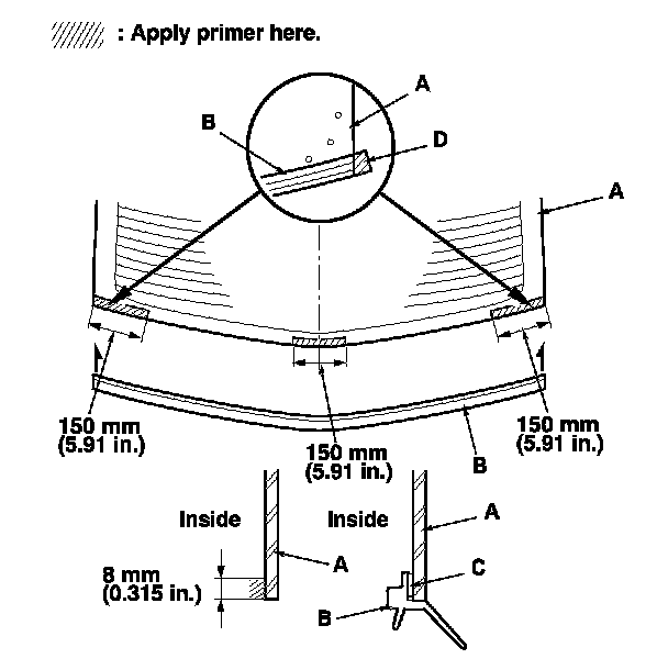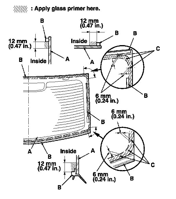 11. Apply primer to the edge of the rear window (A) where the lower rubber dam will be attached as shown. Attach the lower rubber dam (B) with adhesive tape (C) to the lower edge of the rear window: