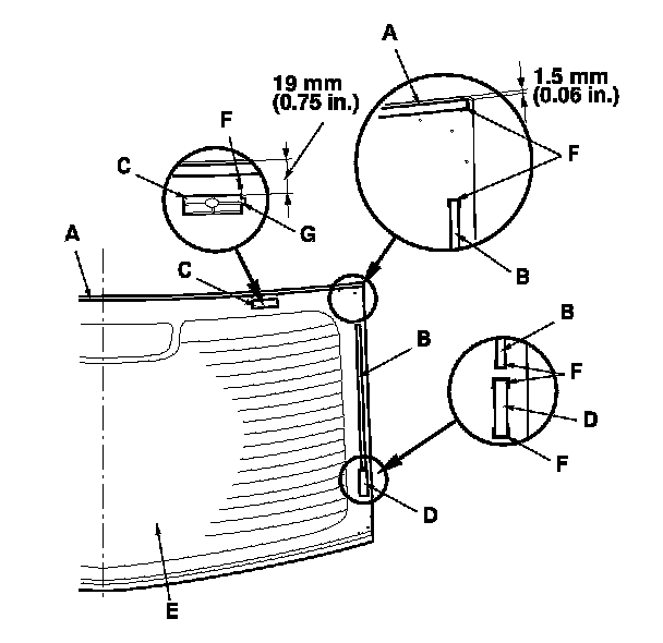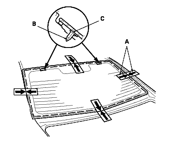 14. Set the rear window in the opening, and center it. Make alignment marks (A) across the rear window and the body with a grease pencil at the four points shown. Make sure the pins (B) of both upper clips (C) contact with the edge of the body holes. Be careful not to touch the rear window where the adhesive will be applied.