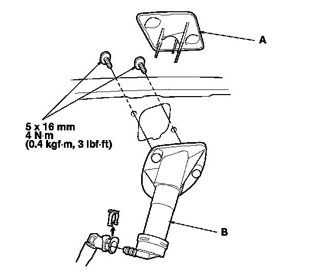 2. Remove the cover (A), tube, mounting screws and headlight washer nozzles (B).