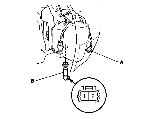 2. Disconnect the 2P connector (A) from the washer fluid level switch (B).
