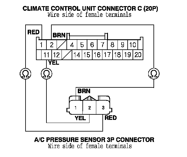 8. Check for continuity between the following terminals of climate control unit connector C (20P) and the A/C pressure sensor 3P connector.