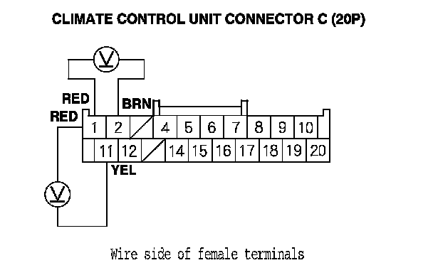 11. Measure the voltage between climate control unit connector C (20P) terminals No. 1 and No. 2, and between climate control unit connector C (20P) terminals No. 1 and No. 11.