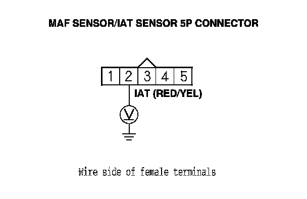 11. Measure the voltage between MAF sensor/IAT sensor 5P connector terminal No. 2 and body ground.