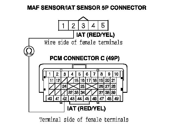 15. Check for continuity between PCM connector terminal C16 and MAF sensor/IAT sensor 5P connector terminal No. 1.