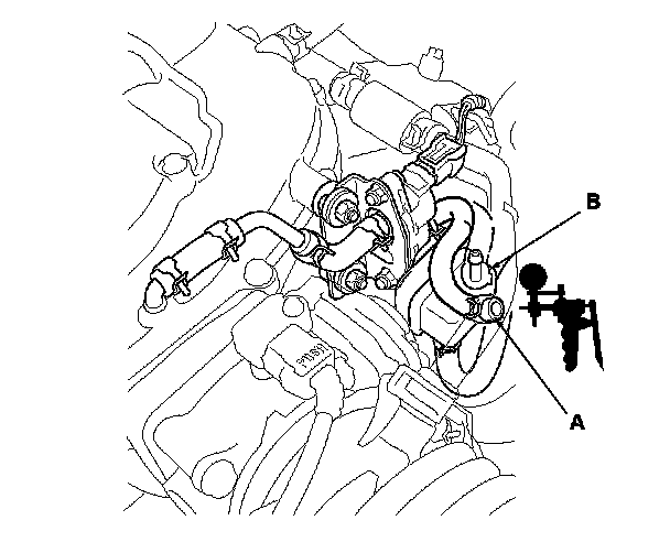 6. Disconnect the vacuum hose (A) from the purge joint (B) in the engine compartment, and connect a vacuum pump/gauge, 0-30 in.Hg, to the hose.