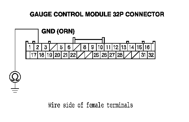 16. Check for continuity between gauge control module 32P connector terminal No. 22 and body ground.