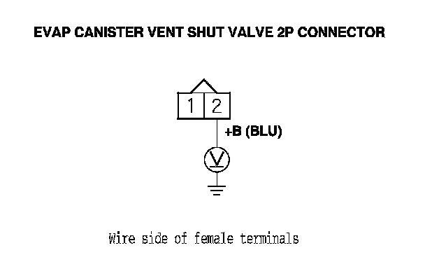 9. Measure the voltage between EVAP canister vent shut valve 2P connector terminal No. 2 and body ground.