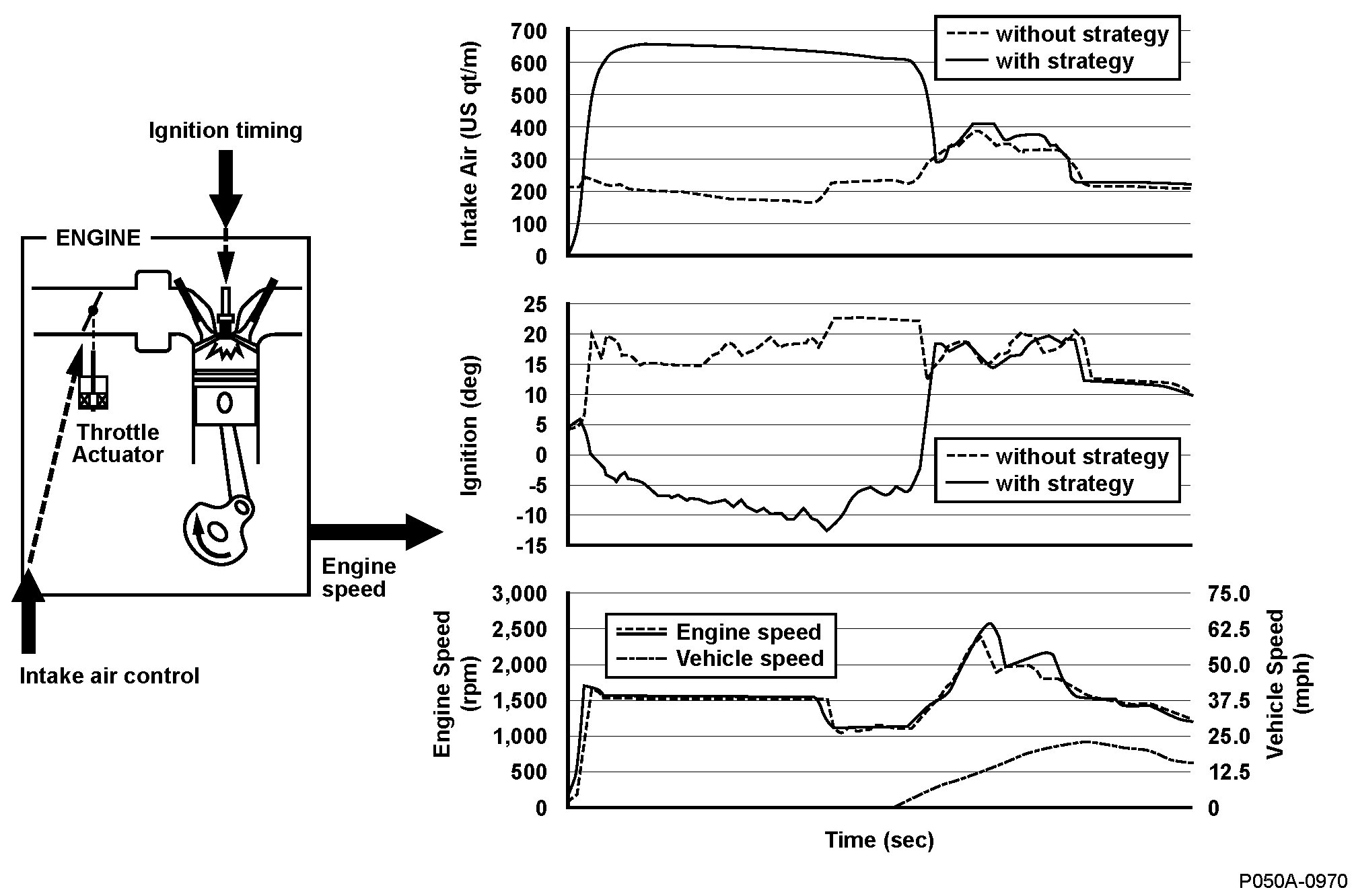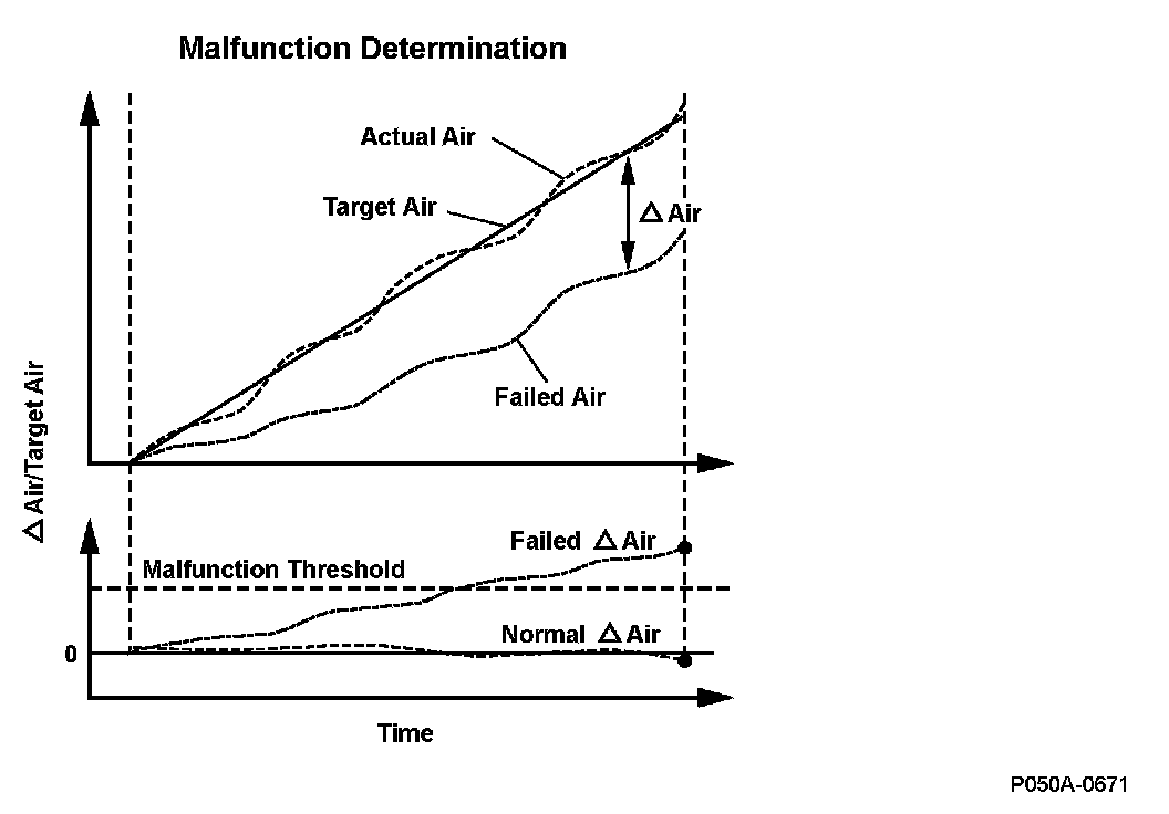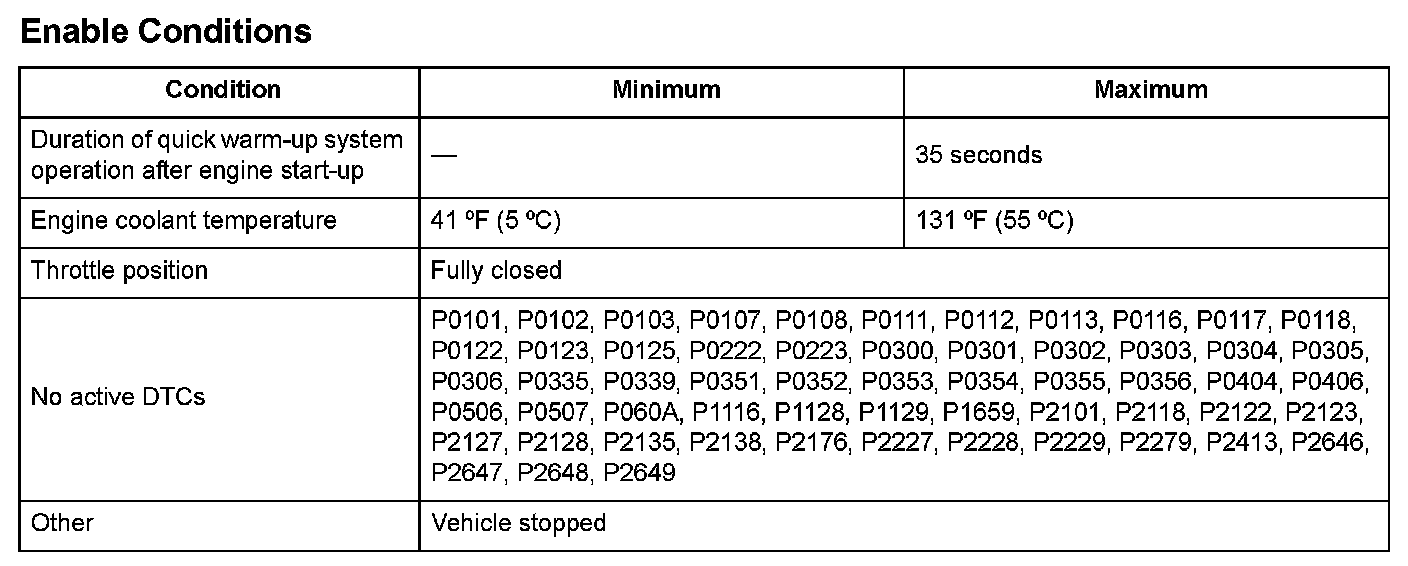 The quick warm-up system supplies additional air and retards the ignition timing when the engine is cold to activate the catalytic converter as quickly as possible. When the actual amount of air is less than the target amount, a malfunction is detected and a DTC is stored.
