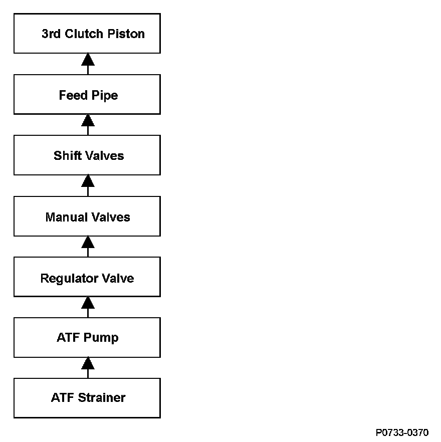 To engage 3rd gear, line pressure is supplied to the 3rd clutch piston, the 3rd clutch is engaged, and the output shaft (countershaft) and the output shaft (countershaft) 3rd gear are connected and revolve together. Hydraulic pressure is supplied to the 3rd clutch through the ATF strainer --> the ATF pump --> the regulator valve --> the manual valve --> the shift valves --> the feed pipe --> the 3rd clutch piston. (A shift valve failure in the supply route above is detected by the malfunction detection of each shift solenoid valve.) The powertrain control module (PCM) computes the ratio of the input shaft (mainshaft) speed to the output shaft (countershaft) speed. When the ratio is not the 3rd gear ratio, it is detected as a malfunction of the hydraulic circuit or the 3rd clutch, and a DTC is stored.