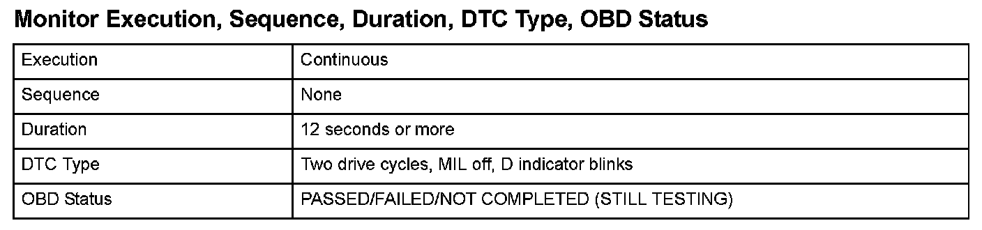 Monitor Execution, Sequence, Duration, DTC Type, OBD Status