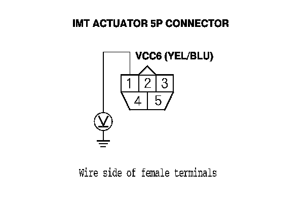7. Measure the voltage between IMT actuator 5P connector terminal No. 1 and body ground.