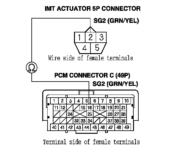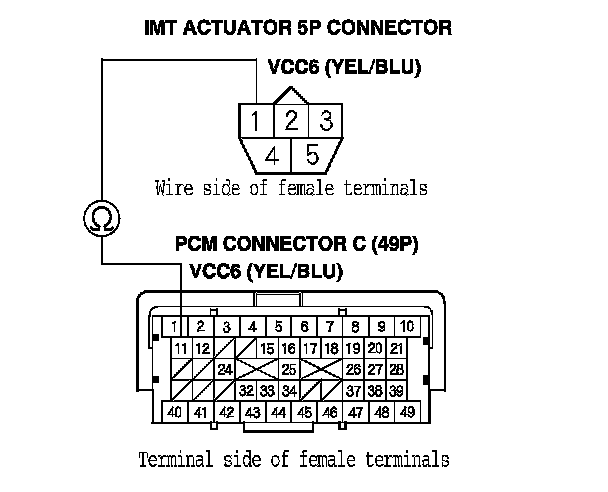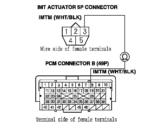 24. Check for continuity between IMT actuator 5P connector terminal No. 4 and PCM connector terminal C49.